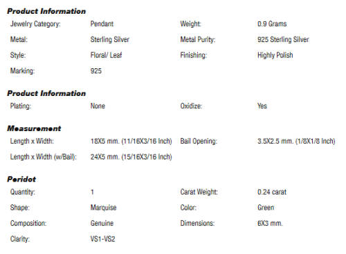 Genuine 925 Sterling Silver Pendant - 0.24ct Genuine Peridot Leaf Design