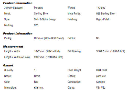 Genuine 925 Sterling Silver Pendant - 0.84ct Genuine Garnet Heart Cut Swirl