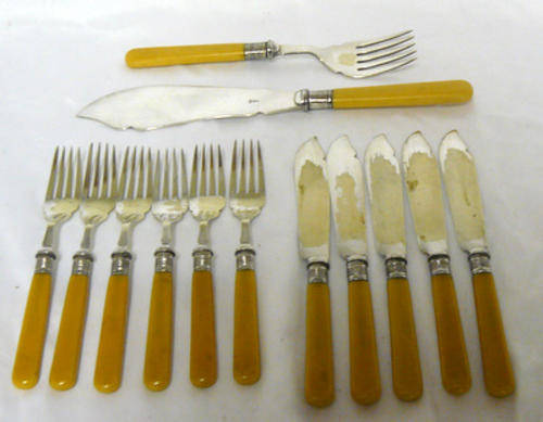 On offer this genuine bone handle fish cutlery set with it's matching serving set, all with very ornate collars. Please note 1 knife is missing out of the set.The knives are 21cm long, the forks 18cm long, the serving knife is 28cm long and the serving fork is 22cm long. There is plate wear on the items, most notably on the blades of the knives, still a lovely set that is becoming rarer by the day. Makers Mark: "WP, EP, B".