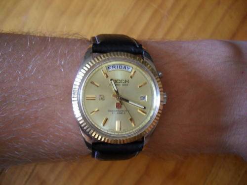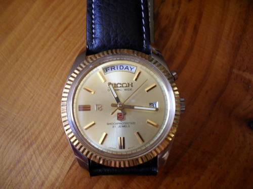BRAND RICOH MODEL DYNAMIC WIDE, 21 JEWELS DIAL REFINISH DIAL WITH GOLDEN CASE STEEL WELL POLISHED CRYSTAL ACRYLIC MACHINE RICOH SIGNED DIAMETER Size of the Case is 36mm in diameter (excluding crown) and Lug to Lug 40mm DIAL ORIGINAL DIAL, PERFECT RESTORED FUNCTION Hours, Minutes, Seconds, etc MOVEMENT WINDING CONDITION PERFECT RESTORED CONDITION ,CLEANED & ADJUSTED MACHINE SIGN CASE, BACK, DIAL, CROWN, MOVEMENT MOVEMENT CALIBER 21 JEWELS