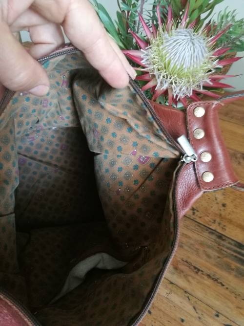 On the base of the bag there is a small area where there is some damage,(see photo) and it seems asif it may have been repaired at some point in time. This is not visible when the bag is carried by hand. The material on the inside of the bag is slightly faded but not torn.