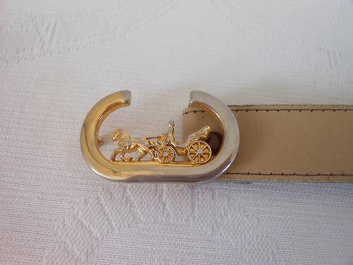 Authentic vintage tan genuine leather belt with stunning horse and carriage Celine Paris style buckle. Good condition, with some wear to leather and loss to gold plating of buckle. To fit waist size 65 cm (smallest hole) to 79 cm (largest hole). 2.5 cm wide.