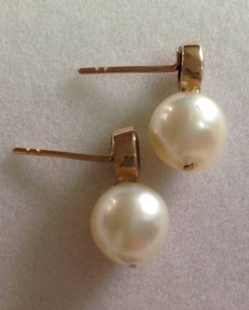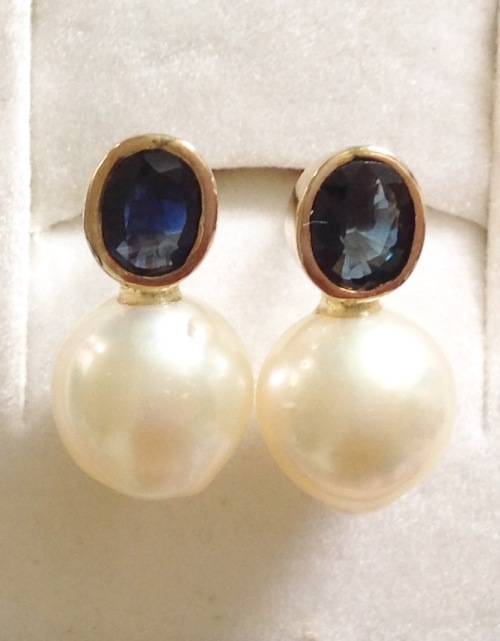 On auction are these genuine Sapphire and Seawater (Akoya) fine Pearl earrings set in solid 9 carat Gold!