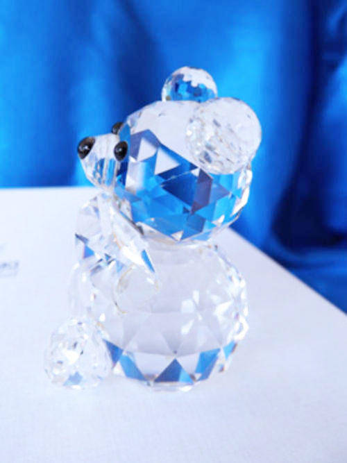 This retired Swarovski crystal bear was designed by Max Schreck and is 2 ¾” (70mm) tall. Made from clear, facetted crystal, with black eyes and nose, he was part of the “Woodland Friends” theme group. He was introduced in 1981 and retired in 2004