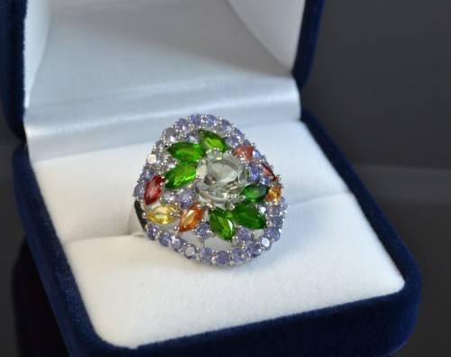 GENUINE GREEN AMETHYST, SAPPHIRE, TANZANITE CHROME DIOPSIDE 925 SILVER RING