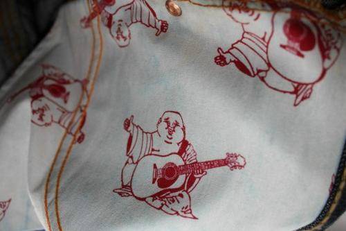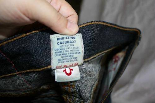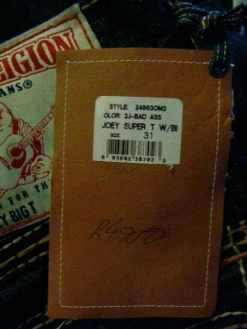 True Religion jeans contain 3 labels on the inside of the jeans with different codes, the one label has the authentic red horseshoe. The pocket flaps on the inside of the jeans are clearly stamped with the True Religion logo, a Buddha.