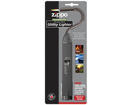 Meet the next generation of the popular outdoor utility lighter. Rubberized flat black finish makes this a great fit for the toolbox, tackle box, or camping gear stash. The flexible extended neck, topped by a lean, powerful nozzle, is slim and sinuous enough to reach even the smallest lighting apertures. The flex neck utility lighter is wind resistant, child resistant, and boasts reliable dual flame technology. Shipped filled with genuine Zippo premium butane