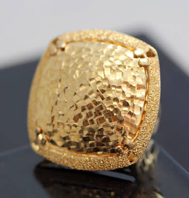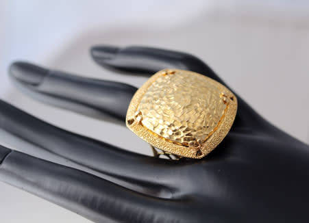 This statement piece is magnificently eye-catching! Hand crafted in gold plated Italian sterling silver, the softly domed 30mm square ring head has a wonderful hammered finish with a broad fine-grained textured border that has rounded corners. On each corner are two forked claws which have a functional as well as decorative purpose. The frame of the ring head has been built up out of a rough tactile gold-hued finish (the structure is sterling silver) that create unexpected sparkle. The solid shank broadens swiftly on the shoulders, featuring an openwork lattice design that holds the ring head a spectacular 10mm above the finger. Weighing a hefty 14,5 grams, the ring sits snugly and comfortably on the finger. The ring bears the 'ITALY' hallmark, the jeweller's personal signature and 925 indicating genuine Italian sterling silver underneath the golden hue. Its a vintage piece but the buff marks are barely worth mentioning. Please note this is not 9ct gold. The finish is gold hue but the ring itself is solid sterling silver. A real conversation-starter!