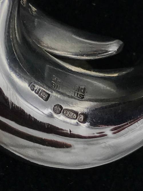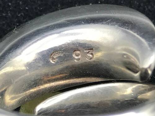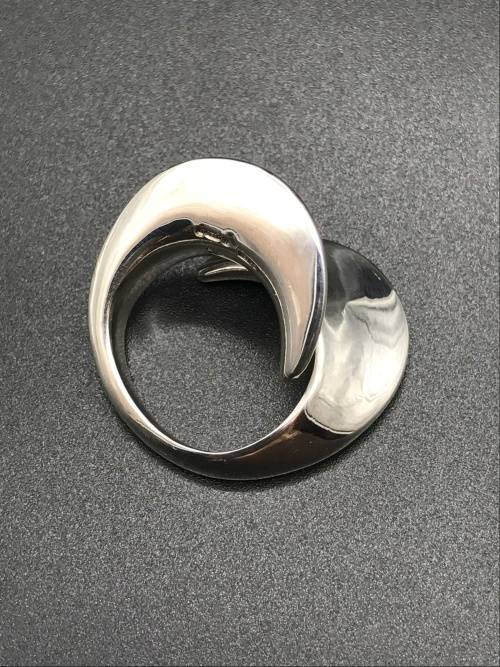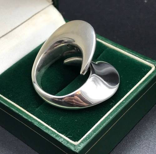 This solid silver overlapping double curve modernist ring (also known as the ‘Flying Saucer’ ring) is stamped ‘Georg Jensen Sterling Denmark.’ It also has the English import mark for London 1963. It was designed by Nanna Ditzel (design no. 93). The ring is in lovely condition.