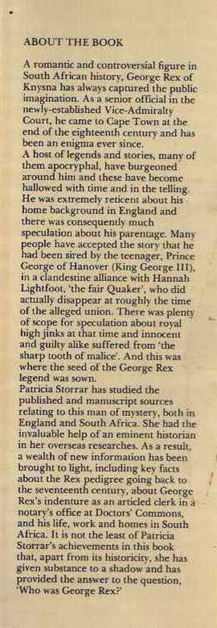 Hard cover ex library book with dust jacket. Book is illustrated with pictures. This book tells about a romantic and controversial figure in South African History, George Rex of Knysna has always captured the public imagination!