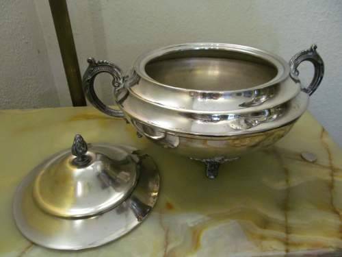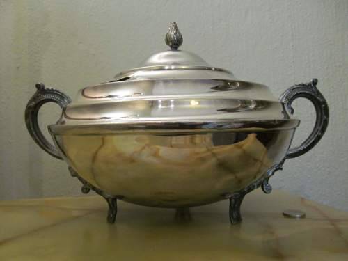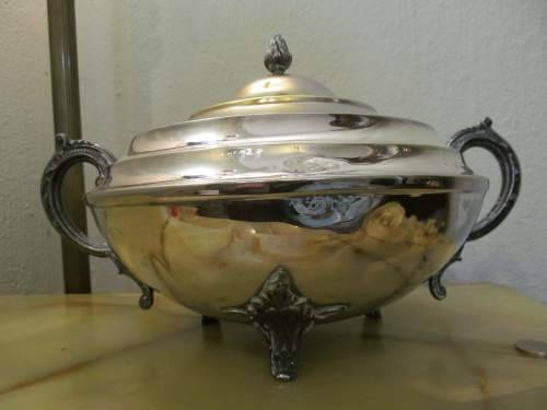 THIS VINTAGE ITEM IS A LAREG SILVER PLATED SOUP / VEGETABLE TUREEN WITH GRADUATED STYLE LID AND MATCHING GRADUATIONS UPON THE SHOULDER PORTION. THE LID HAS A BEAUTIFUL FLAME MOTIF FINIAL WHILE THE TUREEN IS ENHANCED BY THE PRESENCE OF A PAIR OF ORNATELY CRAFTED BM MOUNTED SCROLL HANDLES AS WELL AS THREE BM MOUNTED ORNATELY PLUMED FEET