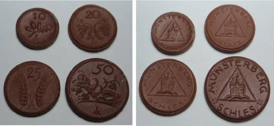 The set we are selling here consist of the 10, 20, 25 and 50 Pfennig from the city of Munsterberg in the Prussian province of Lower Silesia.