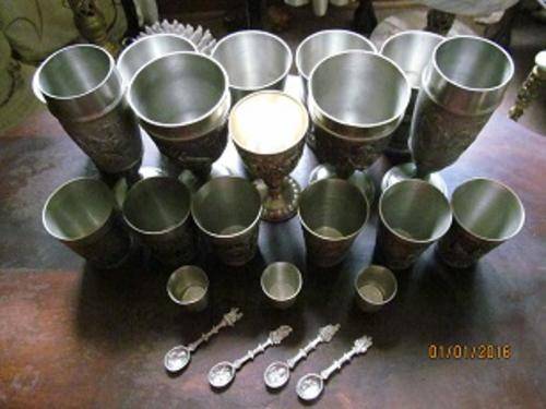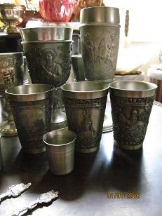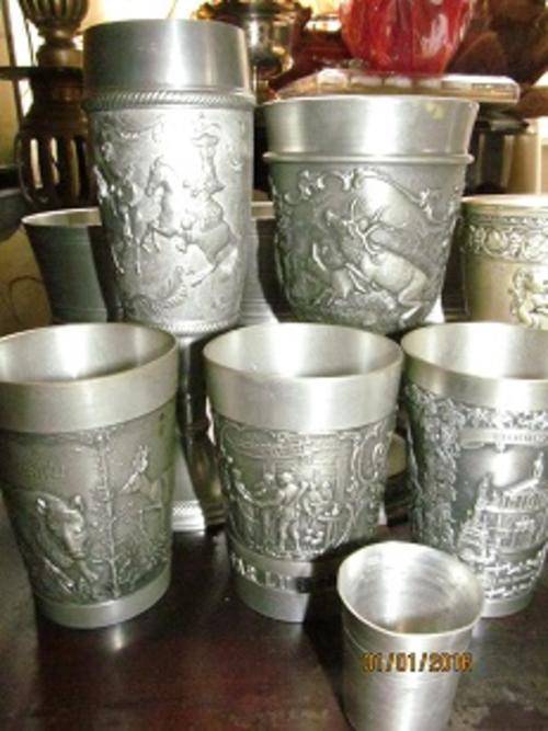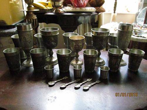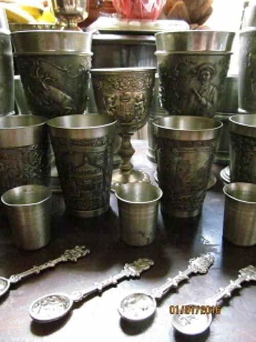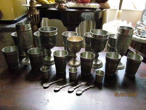 COMPLETE COLLECTION OF 23 Items : 2 Champagne goblets, 2 Big Wine goblets, 1 Middle wine goblet, 5 Beer Mugs, 4 spoons, 3 tots, 6 Wine Mugs - superb all different
