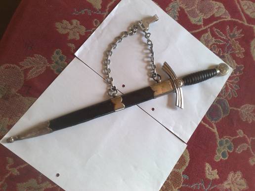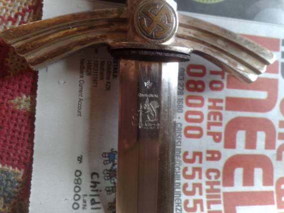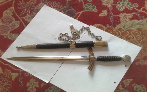 In March 1935 the âÂÂÂÂÂÂÂÂÂÂÂÂFliegerdolchâ was introduced for wear by officers and senior NCO`s.It was based on a similar dagger worn by the German air sports association. (DLV)The grip has a wooden core with dark blue Morocco leather covering. The grooved grip has a triple silver coloured wire wrap.The solid nickel circular pommel features an inlaid brass disk with raised a âÂÂÂÂÂÂÂÂÂÂÂÂsunwheelâ swastika, as did the center of the crossguard, both obverse and reverse. These disks were silver plated as were the pommels with 4-5 microns of silver, the swastika was gold plated with 2-3 microns.Many think that the swastika is a brass insert which is not correct.The metal scabbard fittings, are nickel silver with 3-4 microns of silver plating.The dagger is 46 cm long and has stiletto style blade.Note that this blade has a Waffen amt stamping of a stick bird with a number âÂÂÂÂÂÂÂÂÂÂÂÂ8â which means that this is a government issued dagger, on lease to the person using it.The waffen amt stamp is of the early style stick bird. This number is not seen very often as most of the time it is a âÂÂÂÂÂÂÂÂÂÂÂÂ5âÂÂÂÂÂÂÂÂÂÂÂÂ.Where there is no Waffen amt stamp, it is a personally owned dagger.Waffen-Amt: This mark was applied to government issued weaponry, and it indicates that the item concerned has been tested and accepted by the Ordnance Dept., as a suitable stock item for issueThe blade also has the âÂÂÂÂÂÂÂÂÂÂÂÂEickhornâ manufacturers logo stamping. âÂÂÂÂÂÂÂÂÂÂÂÂA squirell holding a swordâÂÂÂÂÂÂÂÂÂÂÂÂUnder the crossguard is the lettering âÂÂÂÂÂÂÂÂÂÂÂÂFlg.St.Fea37/19â These are property stampings of  Fliegerschule âÂÂÂÂÂÂÂÂÂÂÂÂFlieger-Ersatz-Abteilung 5 (Fea 5)â which was an aviation replacement detachment based in Hanover. 1937 dagger number 19.