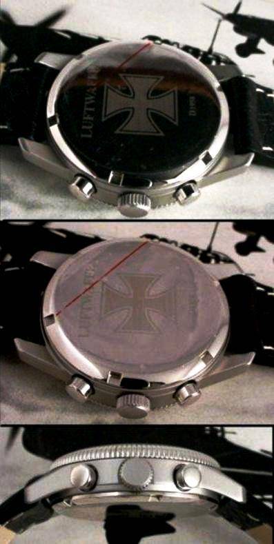 Its case construction is brushed solid stainless steel for years of rugged durability. I find the coin edge bezel to be especially attractive. The synthetic sapphire crystal is highly scratch resistant and is semi-domed. The polished stainless steel screw down back is nicely engraved with “ Luftwaffe ” the “ German Iron Cross, ” and a designation of “ D1958.” The case is water resistant for normal wear, such as washing hands, jumping into the shower, etc.
