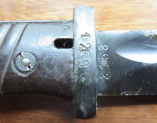 GERMAN WW2 S84/98 MAUSER BAYONET WITH GROOVED BAKELITE GRIPS-METAL BAYONET WITH ASW 44 MARKINGS-THE BAYONET & SCABBARD WITH MATCHING NUMBERS-TOTAL LENGTH FOR BAYONET 383MM