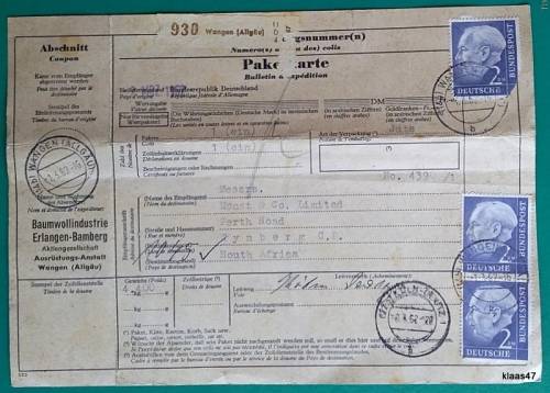 Germany - 1962 - Parcel Card - No. 930 Wangen (Allgau) - To Monat and Co, Cape Town Germany - 1962 - Parcel Card - No. 930 Wangen (Allgau) - To Monat and Co, Cape Town Germany - 1962 - Parcel Card - No. 930 Wangen (Allgau) - To Monat and Co, Cape Town Germany - 1962 - Parcel Card - No. 930 Wangen (Allgau) - To Monat and Co, Cape Town