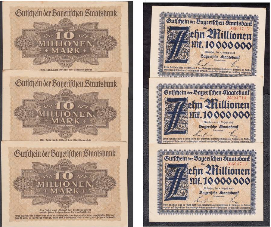Germany: 3 x 10 Million Mark Bayerische Staatsbank 1 August 1923 in Sequential Order