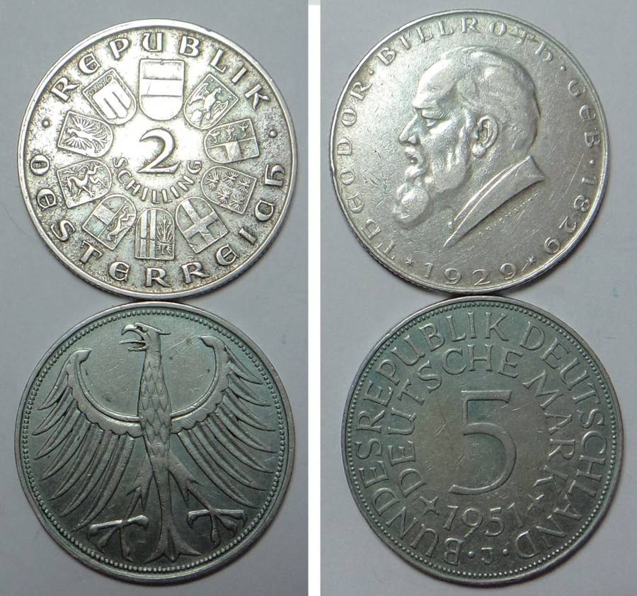 Germany 5-Mark (1951J) & Austria 2-Schilling 1929 (Dr. Theodor Billroth)