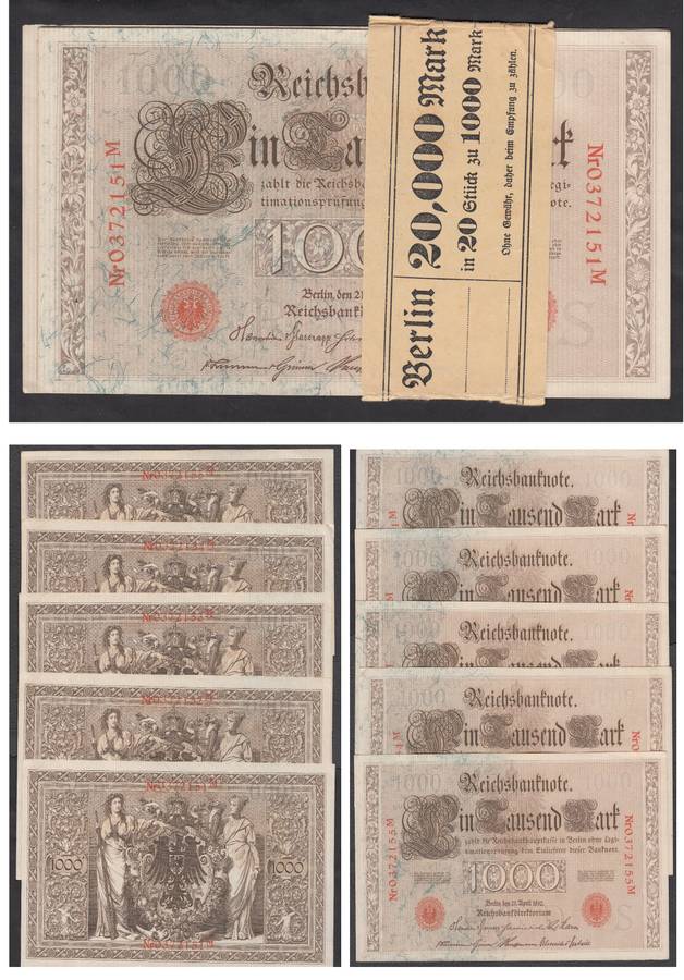 Germany: 5 x 1000 Mark Reichsbanknote of 21 April 1910 in Sequential Order