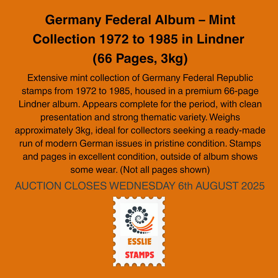 Extensive mint collection of Germany Federal Republic stamps from 1972 to 1985, housed in a premium 66-page Lindner album. Appears complete for the period, with clean presentation and strong thematic variety. Weighs approximately 3kg, ideal for collectors seeking a ready-made run of modern German issues in pristine condition. Stamps and pages in excellent condition, outside of album shows some wear.