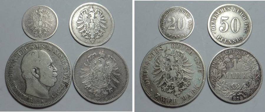 20-Pfennig 1873B, 50-Pfennig 1876A, 1 Mark 1875B and 2-Mark 1876A.