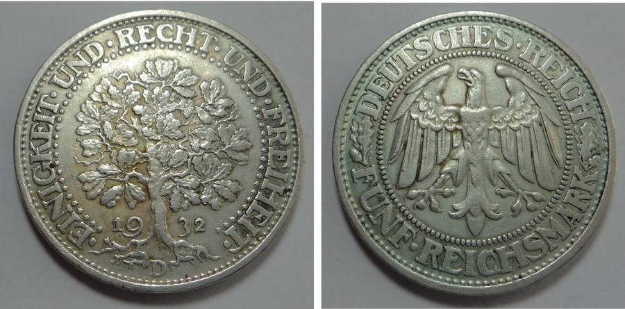 Germany, Weimar Republic, Silver 5-Mark of 1932 (D)