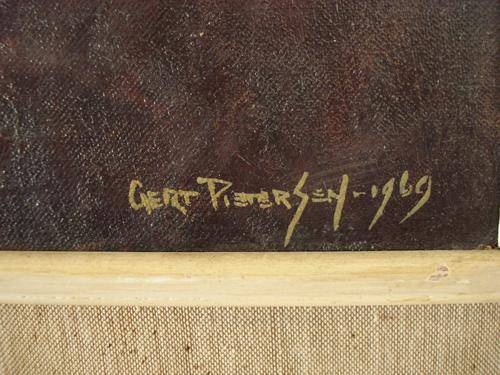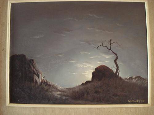 NIGHT LANDSCAPE SCENE IN OIL BY GERT PIETERSEN.GERT PIETERSEN WAS BORN IN 1930 IN NORTHEN TRANSVAAL.HIS KNOWN FOR HIS LANDSCAPES.PAINTING IS IN GOOD CONDITION BUT FRAME IS DAMAGED.NEEDS REFRAMING.82cm x 67cm WITH FRAME.60cm x 45cm WITHOUT FRAME.POSTAGE R120