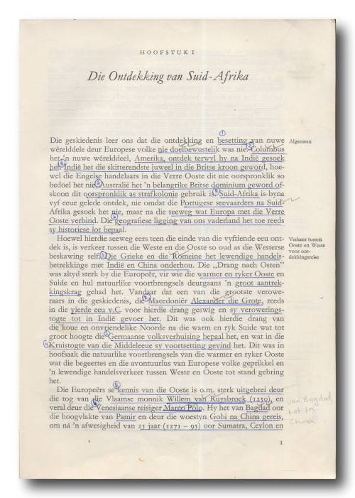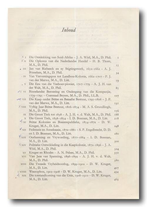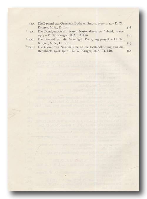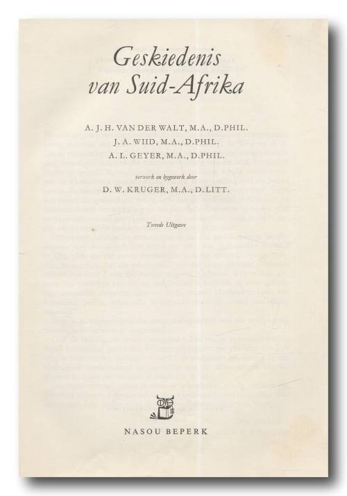 Geskiedenis van Suid-Afrika verwerk en bygewerk deur DW Kruger. A5, hardeband, 620 bls. Buiteblad redelik verweer. Boek binne in leesbare toestand. Sommige bladsye het potlood-onderstreep en aantekeninge op. Een bladsy voor het 'n skeur. Boek voor en agter versterk met Masking Tape. Naam van vorige eienaar voor in boek.