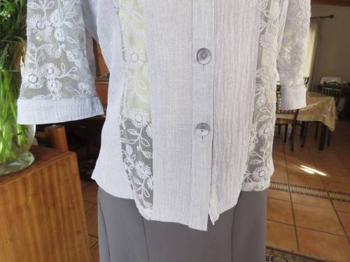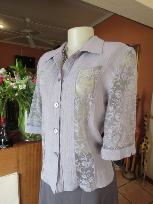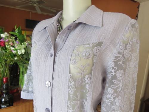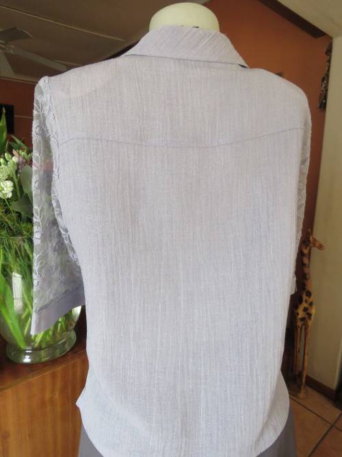Get noticed in this pale steelblue top by 'HIGH SENSE' in size 36/12.Long short sleeves in lace.Yoked back and front with vertical lace inlays on front.Button down with shirt collar.In blend of polyester and rayon.New.