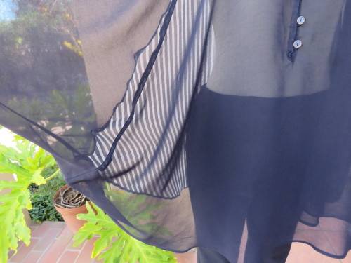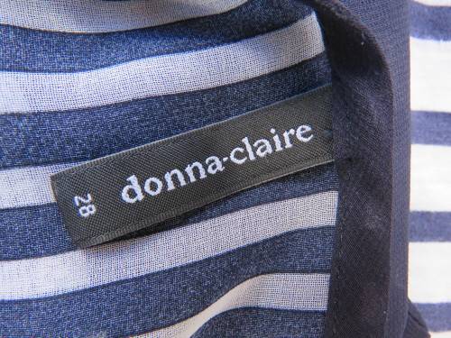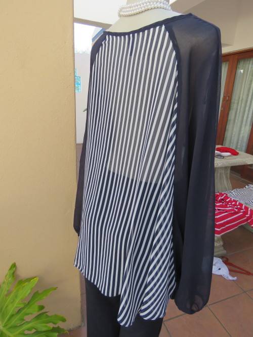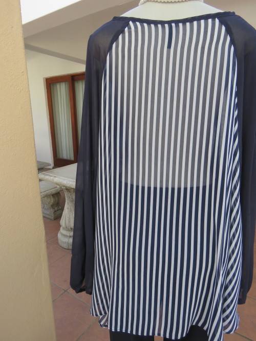 Get noticed in this sheer navy top with kimono sleeves by 'DONNA CLAIRE' in size 52/28.Navy and white vertical striped back.Opening on front closing with buttons and loops.Rounded seams.New condition.