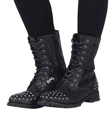 Featuring sequin side panels, silver stud accents on the toe and heel, side zipper, sparkly glitter laces, a durable sole and toe guards.