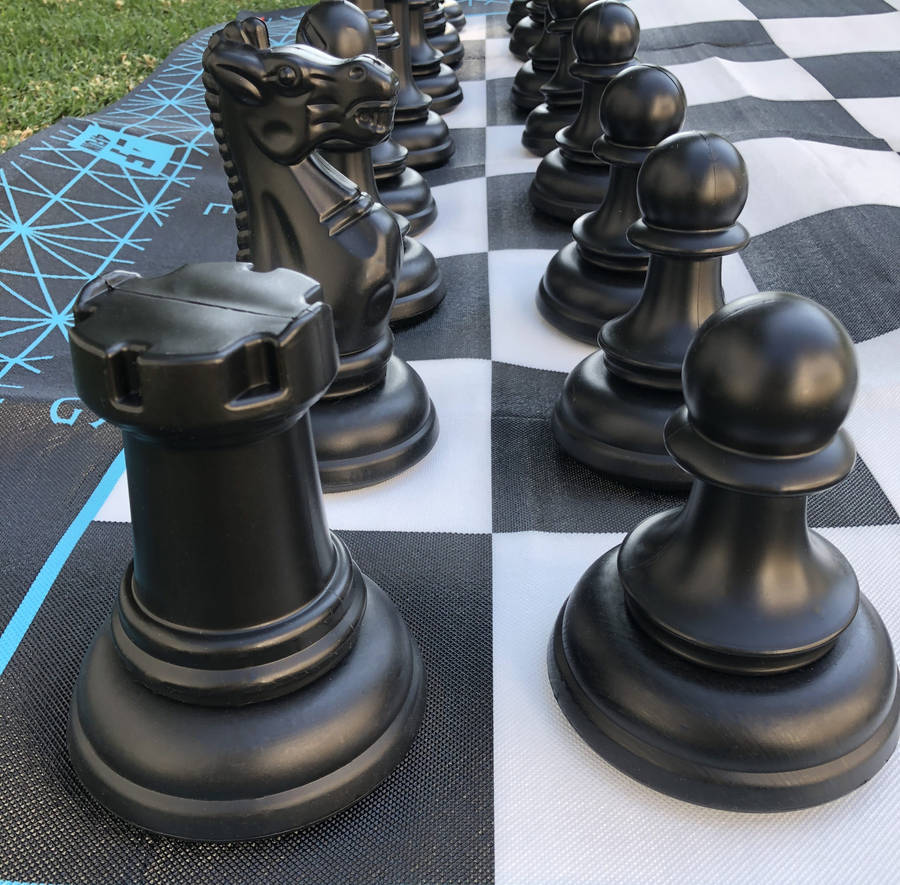 The large game board mat can be placed flat on both floors or lawns and measures 180x160cm. The giant plastic pieces include 32 chess pieces in black and white. The King piece measures 24cm high. The base of the chess pieces can be removed and flipped over for a fun game of draughts. All items can be conveniently stored in the large stargae bag with carry handles for easy portability.