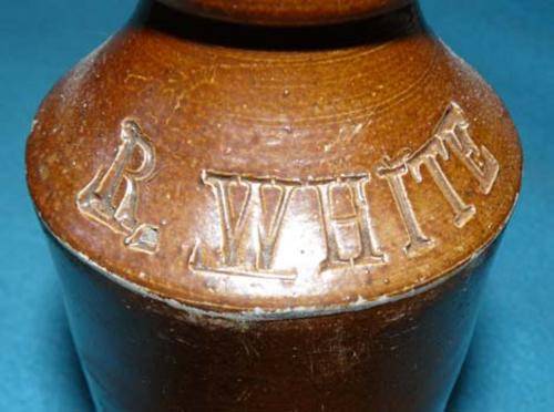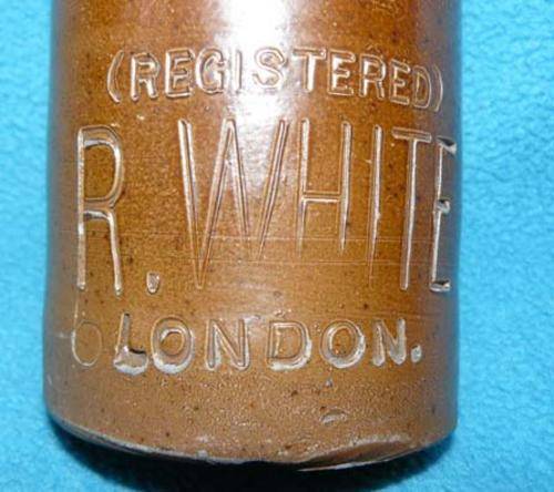 While this bottle has London impressed in it, it is of interest to South African collectors because the firm R. White & Sons Ltd, Albany Rd, Camberwell, London granted the rights to Kops & Rawlings SA to manufacture & sell Rawlings Ginger Ale. It therefore has a definite connection to South African bottles (and was in fact dug up here on the Cape Town driftsands dump). The bottle is 17cm high and in good condition, with signs of wear around the rim.