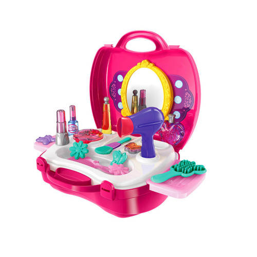 Little girl beauty set comes with totally 21 pieces plastic toys in a portable carrying case,like hair dryer,comb,brush,mirror,hair clips,stickers,and so on.
