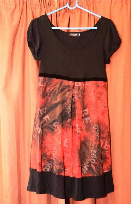 Red and black dress. Black top part made of cotton lycra, skirt part made of stretch fabric. You can't see it on the photo, but on the skirt part the letters have red glitter around the edges. The size of the dress is Medium. A black velvet ribbon separates the top and skirt parts on the front.