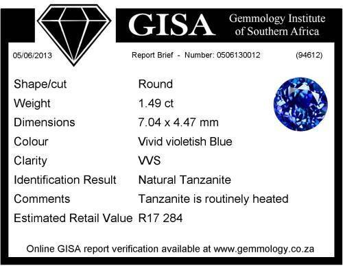 GISA CERTIFIED 1.49 TANZANITE (VVS)VIVID VIOLET BLUE (R17284)