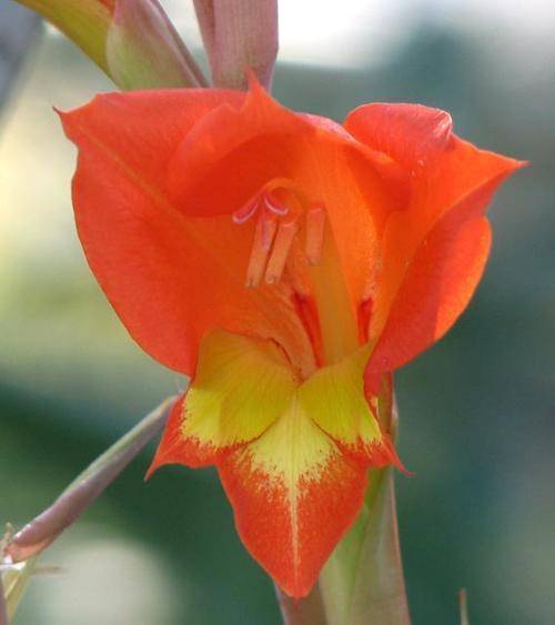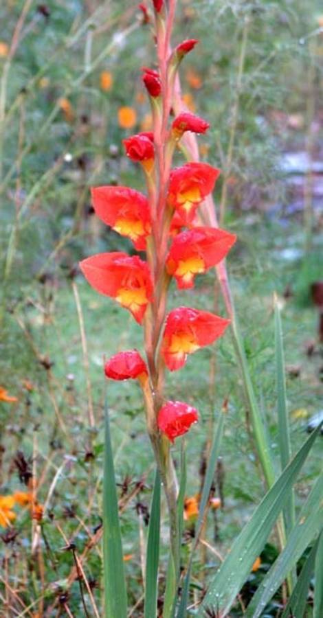 Gladiolus dalenii, an indigenous species corm, is native to the summer rainfall areas of South Africa.It is vigorous and easy to grow, and sends up tall( up to 2m long) bi-coloured orange/yellow flower spikes in autumn. Requires full sun(or half a day’s sun at least) and well composted, but not rich soil, and average watering.