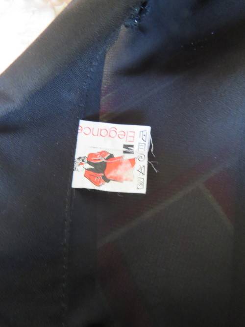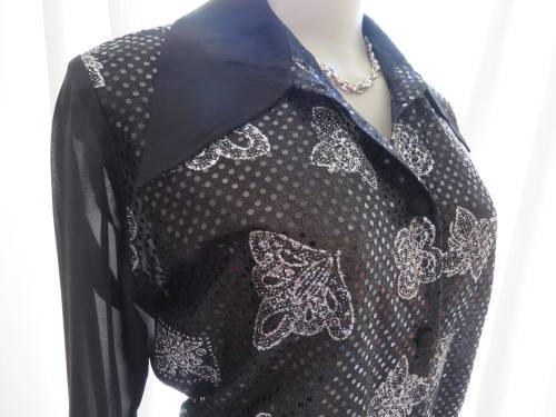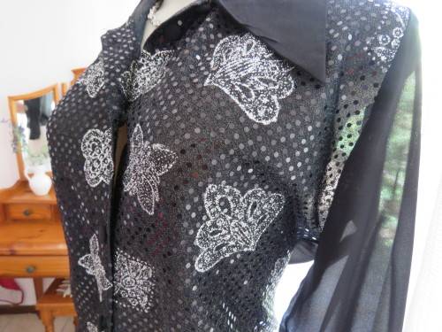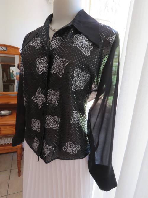 Glamorous black ELEGANCE blouse in sheer polyester back and long cuffed sleeves.Size 36/12.Front in stretch sequined polyester.Button down with covered buttons and pretty shirt collar.As new