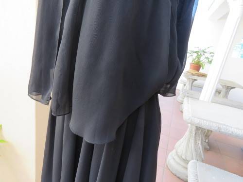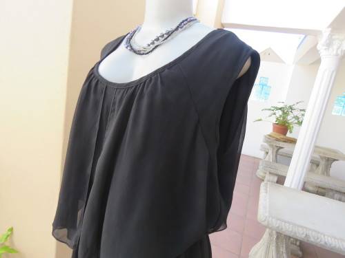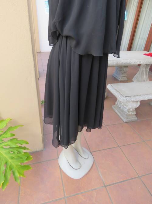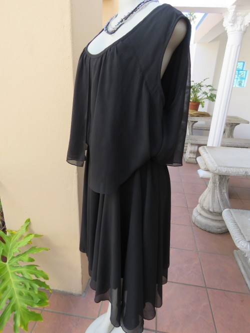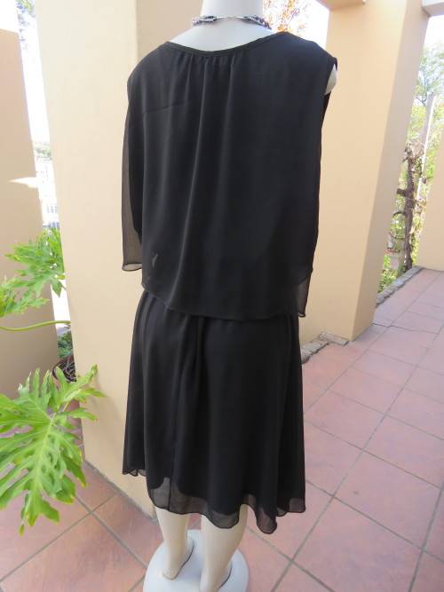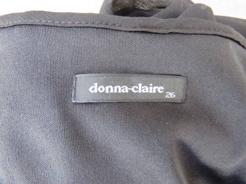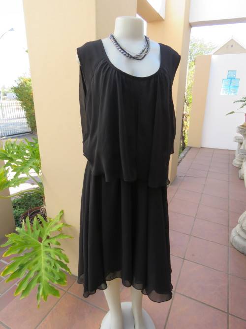 Glamorous sleeveless black special occasion dress by 'DONNA CLAIRE' in 50/26.Elasticated waist.?Round neckline with overlay on front and back bodice with asymmetrical seamline. Fully lined in 100% stretch polyester.Dress in sheer polyester.New condition.