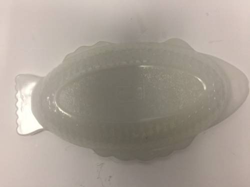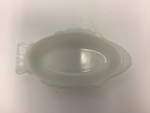 Small milk glass dish or platter shaped like a fish, mid-century vintage Glasbake oven proof glass. This measures long end to end at 23.5cm and is about 12cm wide.