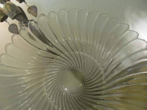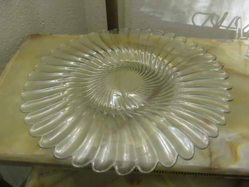 A MOLDED GLASS VINTAGE ITEM MAGNIFICENTLY DESIGNED TO HAVE A SUPERB FLORAL APPEARANCE WITH A SERIES OF CONCAVE AS WELL AS CONVEX FLUTED SWIRLS IN A SERIES AROUND THE RIM REACHING TOGETHER INTO THE CLEAR CENTER. THE DESIGN CREATES A SCALLOPED RIM WITH TIPS FLARED GENTLY ABOVE THE DISH