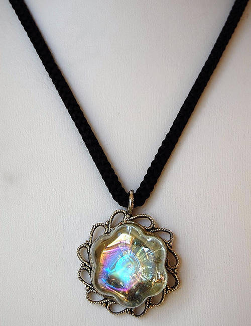 GLASS PENDANT IN ORNATE METAL SETTING
