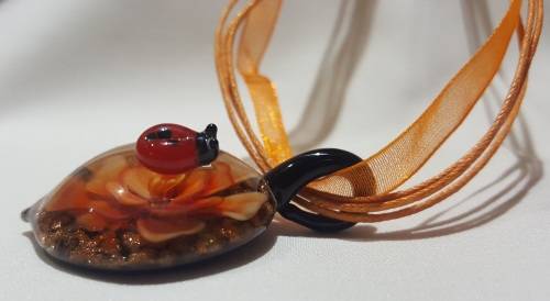 Flower and ladybug detail glass pendant.