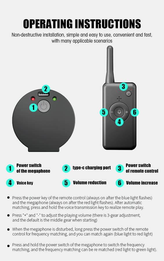 - High-fidelity sound reinforcement. High-fidelity can only be digital, high-definition sound quality. The speaker volume is about 100 decibels and the sound transmission distance is about 100 meters.