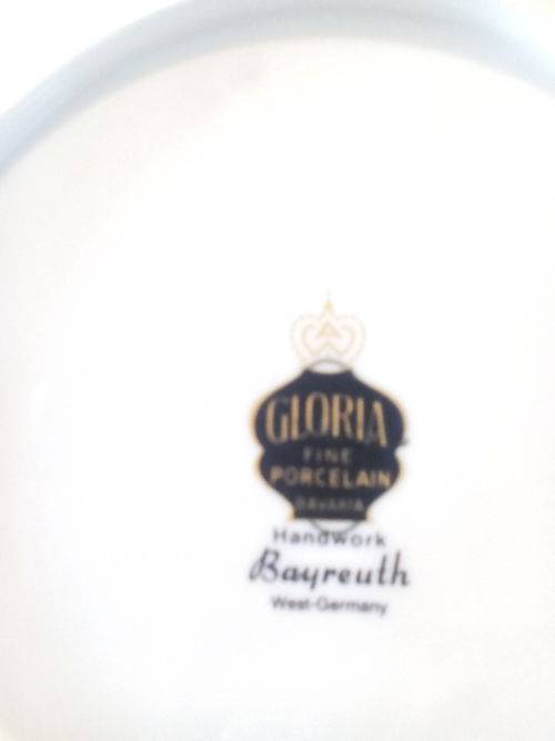 Attractive tea trio with a golden Forsythia pattern in arching sprays Gilt line to inner cup and to all edges in good condition. Decorative rosette to inner saucer. Signed Gloria fine porcelain Bavaria and handwork, Bayreuth, West Germany. Side plate measures 190mm across. Saucer measures 140mm across. Cup measures 60mm high and 90mm across the top. Please note that there is a small chip to bottom of cup.