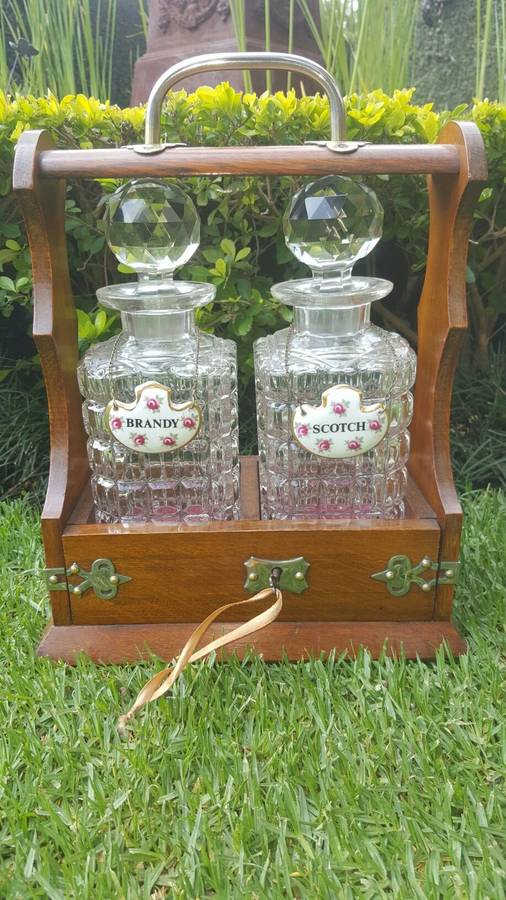 Glorious Edwardian Oak Tantalus with Pristine Original Crystal Decanters and Original Key