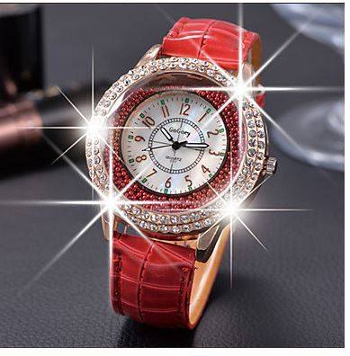 GO-GOEY RED 2 ROW CRYSTAL AND MOTION CRYSTALS WOMAN'S ANALOG QUARTZ FAUX RED LEATHER BAND WATCH