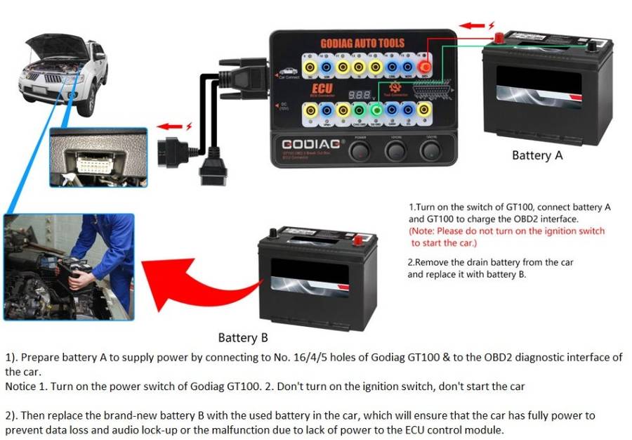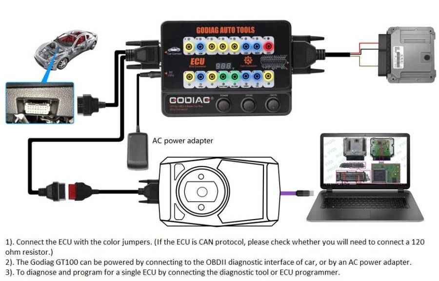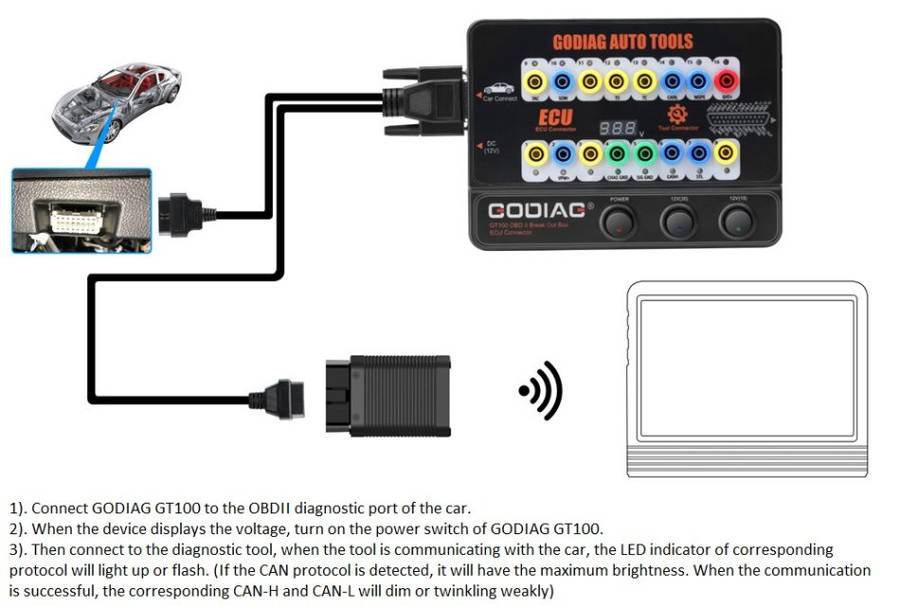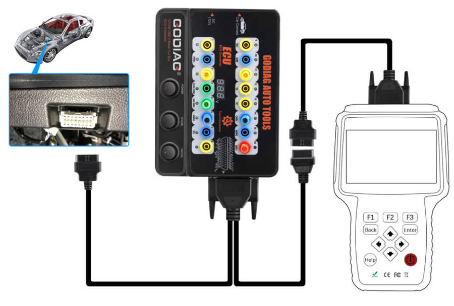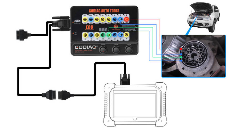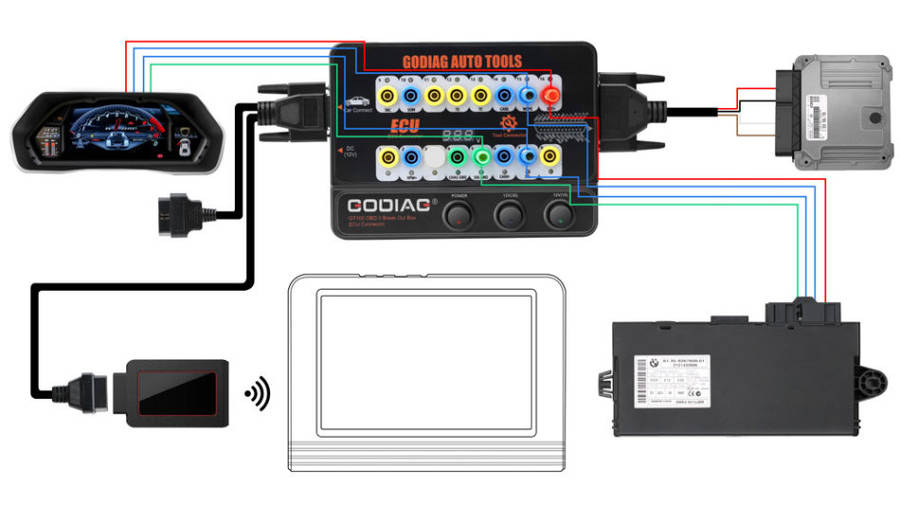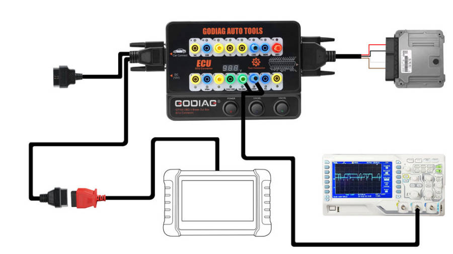 GODIAG GT100, connected to a single ECU module, is convenient for a user to do the single-module diagnosis and programming.
