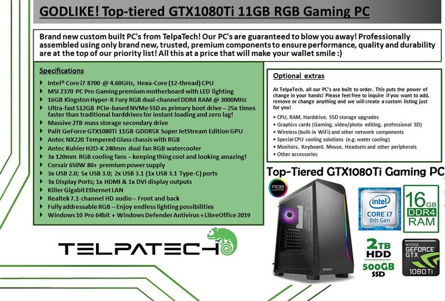 GODLIKE!! Top-tiered RGB GTX1080Ti Gaming PC - *8th Gen i7, 16GB RGB, NVMe + HDD, GTX1080Ti 11GB*